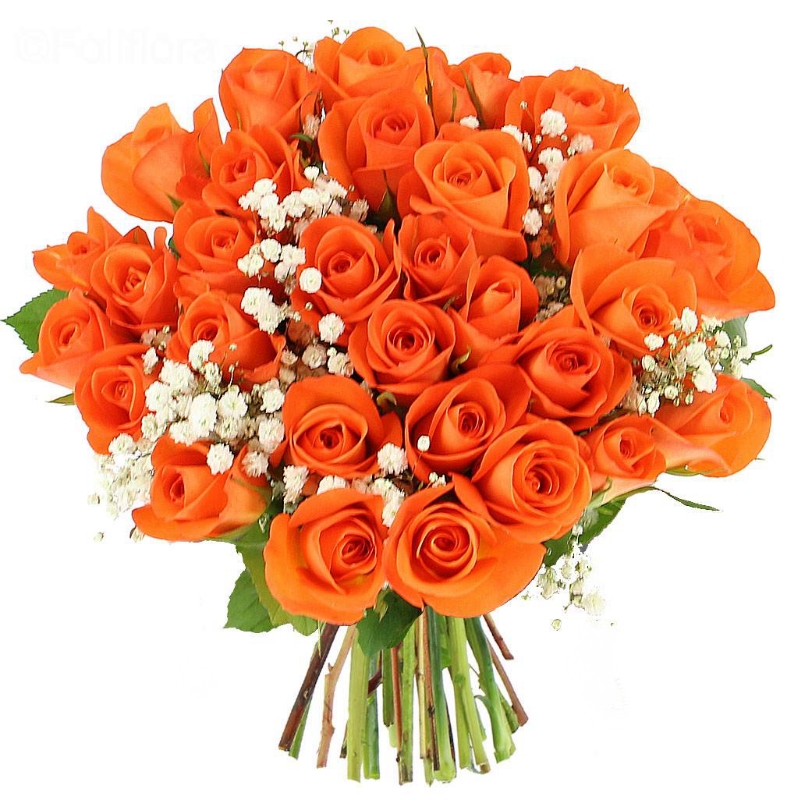 Букет состоит из 35 оранжевых роз, 4 гипсофила, прозрачная упаковка, атласная лента.