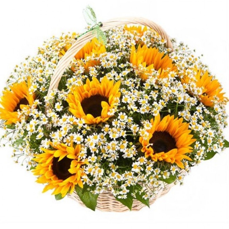 Букет состоит из 11 подсолнухов, 20 веток танацетума, корзина, оазис.