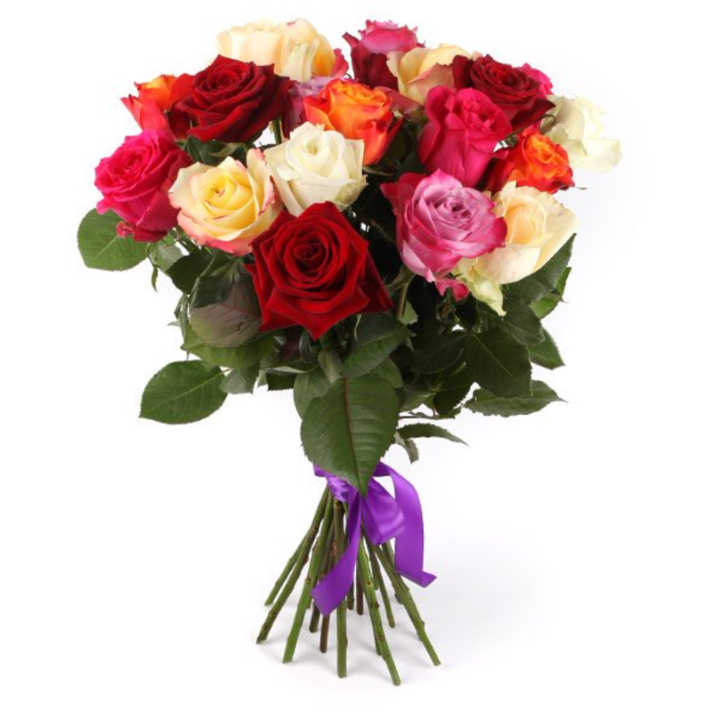 Букет состоит из MIX из 21 розы, прозрачная упаковка, атласная лента.